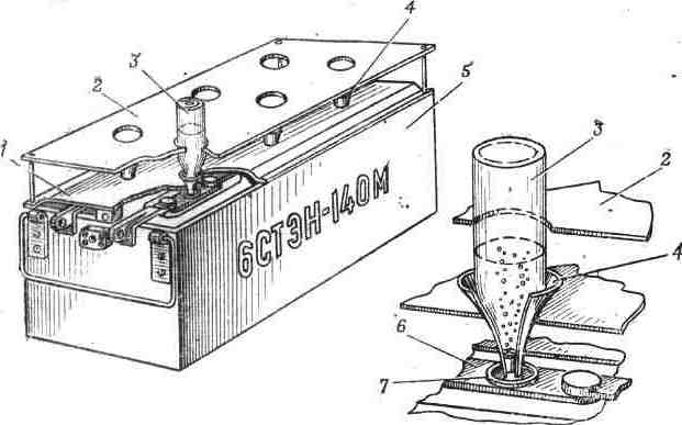 * Напряжение 33... 34 В указано для 24-вольтовых батарей. Батареи 12-вольтовые для заряда необходимо соединить параллельно-последовательно в группы, чтобы общее напряжение группы было 24 В. Процесс ручной заливки 12-вольтовых батарей значительно ускоряется при применении -простого приспособления, изготовленного из батарейной крышки, скрепленной с фанерным щитком (рис. 1). В фанерном щитке выполнены отверстия, а в батарейной крышке закреплены (приклеены) воронки по числу аккумуляторов в батарее. Воронки располагаются и крепятся таким образом, чтобы при установке приспособления на батарею их нижние концы входили в заливные отверстия аккумуляторов.