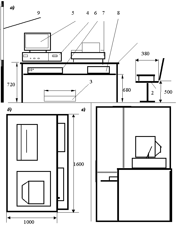 Таким образом, можно сказать, что общая оценка условий труда равна 3.2 – т.е. вредные условия труда второй степени. Это вредные условия труда, характеризующиеся наличием вредных производственных факторов, приводящих к в большинстве случаев к росту заболеваемости с временной утратой трудоспособности, повышением частоты заболеваемости, проявлением начальных признаков профессиональной патологии. 3 Организация рабочего места программиста Производственная деятельность программиста, заставляет его продолжительное время находиться в сидячем положении, которое является вынужденной позой, поэтому организм постоянно испытывает недостаток в подвижности и активной физической деятельности. При выполнении работы сидя большую роль играет плечевой пояс. Перемещение рук в пространстве влияет не только на работу мышц плечевого пояса и спины, но и на положение позвоночника, таза и даже ног. Чтобы исключить возникновение заболеваний необходимо иметь возможность свободной перемены поз. Необходимо соблюдать режим труда и отдыха с перерывами, заполняемыми “отвлекающими” мышечными нагрузками на те звенья опорно-двигательного аппарата, которые не включены в поддержание основной рабочей позы. Антропологические характеристики человека определяют габаритные и компоновочные параметры его рабочего места, а также свободные параметры отдельных его элементов. По условиям работы рабочее место программиста относится к индивидуальному рабочему месту для работы сидя. Рабочее место программиста должно занимать площадь не менее 6 мІ , высота помещения должна быть не менее 4 м, а объем - не менее 20 м 3 на одного человека. После проведения анализа рабочего места программиста в лаборатории было выяснено, что площадь данного рабочего места составляет 4 м 2 , а объем 12 м 3 , что не соответствует приведенным требованиям. Также в результате анализа были выявлены нарушения в организации непосредственно самого рабочего места программиста. В связи с этим я предлагаю организовать рабочее место программиста, следующим образом. Высота над уровнем пола рабочей поверхности, за которой работает оператор, должна составлять 720 мм. Желательно, чтобы рабочий стол оператора при необходимости можно было регулировать по высоте в пределах 680 - 780 мм. Оптимальные размеры поверхности стола 1600 х 1000 кв. мм. Под столом должно иметься пространство для ног с размерами по глубине 650 мм. Рабочий стол оператора должен также иметь подставку для ног, расположенную под углом 15° к поверхности стола. Длина подставки 400 мм, ширина - 350 мм. Удаленность клавиатуры от края стола должна быть не более 300 мм, что обеспечит оператору удобную опору для предплечий. Расстояние между глазами оператора и экраном видеодисплея должно составлять 40 - 80 см. Рабочий стул программиста должен быть снабжен подъемно-поворотным механизмом. Высота сиденья должна регулироваться в пределах 400 - 500 мм. Глубина сиденья должна составлять не менее 380 мм, а ширина - не менее 400 мм. Высота опорной поверхности спинки не менее 300 мм, ширина - не менее 380 мм. Угол наклона спинки стула к плоскости сиденья должен изменяться в пределах 90 - 110 ° . Схема рабочего места оператора приведена на рисунке 2. На рисунке цифрами обозначены: 1)стол; 2)стул; 3)подставка для ног; 4)системный блок; 5)монитор; 6)клавиатура; 7)принтер; 8)лоток для бумаги; 9)ок