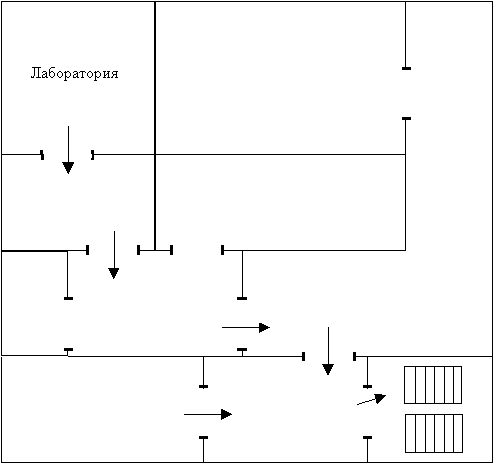 В целях предотвращения пожара предлагаю проводить с инженерами, работающими в лаборатории, противопожарный инструктаж, на котором ознакомить работников с правилами противопожарной безопасности, а также обучить использованию первичных средств пожаротушения. В случае возникновения пожара необходимо отключить электропитание, вызвать по телефону пожарную команду, эвакуировать людей из помещения согласно плану эвакуации, приведенному на рисунке _ 4.1 и приступить к ликвидации пожара огнетушителями. При наличии небольшого очага пламени можно воспользоваться подручными средствами с целью прекращения доступа воздуха к объекту возгорания.