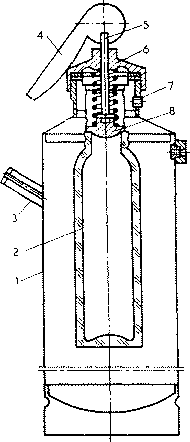 1- корпус; 2- стакан с кислотной частью заряда; 3-ручка; 4- рукоятка; 5- шток; 6- крышка; 7- спрыск; 8- клапан. Рисунок 1 — Химический пенный огнетушитель ОХП -10 Таблица 1 - Технические характеристики химических пенных огнетушителей