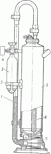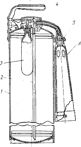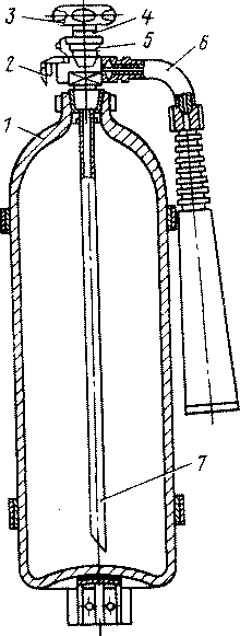 1- баллон; 2- предохранитель; 3- маховичок вентиля-запора; 4- металлическая пломба; 5- вентиль; 6- поворотный механизм с раструбом; 7- сифонная трубка. Рисунок 3 - Углекислотный огнетушитель ОУ - 5 Углекислотные огнетушители (ОУ-2, ОУ-5, ОУ-8) предназначены для тушения загораний различных веществ и материалов, за исключением веществ, которые могут гореть без доступа воздуха, загораний на электрофицированном железнодорожном и городском транспорте, электроустановок под напряжением до 380 В. Температурный режим хранения и применения углекислотных огнетушителей от минус 40 °С до плюс 50 °С. Углекислотно-бромэтиловые огнетушители ОУБ-3А и ОУБ-7А представляют собой стальные тонкостенные баллоны (толщина стенки 1,5-2 мм) сварной конструкции. В горловину баллона ввернута запорная головка рычажного типа с распыляющей насадкой и сифонной трубкой. Емкость баллонов соответственно 3,2 и 7,4 л. Огнетушащим зарядом является состав 4НД (97 % бромэтила и 3 % углекислого газа). Огнегасительное действие бромистого этила основано на торможении химических реакций горения, поэтому его часто называют антикатализатором или ингибитором. Для выброса заряда в огнетушитель закачивают воздух под давлением 0,9 МПа. Время действия огнетушителей 20-30 с при длине струи 3-4 м. Огнетушители этого типа предназначены для тушения небольших загораний различных горючих веществ, тлеющих материалов, а также электроустановок, находящихся под напряжением до 380 В. Их используют в складских помещениях, на грузовых и специализированных автомобилях, на бензораздаточных колонках и т.д. Огнетушители могут быть применены при температуре окружающего воздуха от минус 60 °С до плюс 60 °С. Огнегасительный эффект этих огнетушителей в 14 раз выше, чем углекислотных. Огнетушители аэрозольные (хладоновые) используют в тех же случаях, что и угдекислотно-бромэтиловые. Огнетушащий состав хладон (фреон), 114В2, 13В1 в процессе пожаротушения не оказывает воздействия на защищаемые материалы и оборудование, что позволяет использовать данные огнетушители при тушении пожаров электронного оборудования, картин и музейных экспонатов. Наша промышленность выпускает огнетушители марок ОАХ, ОХ-3 и др. 3.4 Огнетушители порошковые Для тушения небольших очагов загораний горючих жидкостей, газов, электроустановок напряжением до 1000 В, металлов и их сплавов используются порошковые огнетушители ОП-1, ОП-25, ОП-10. Порошковый огнетушитель ОП-1 “Спутник” емкостью 1 л используется при тушении небольших загораний на автомобилях и сельскохозяйственных машинах. Состоит из корпуса, сетки и крышки, изготовленных из полиэтилена. Заполнен составом ПСБ (порошок сухой бикарбонатный), состоящий из 88 % бикарбоната натрия с добавлением 10 % талька марки ТКВ, стеаратов металлов (железа, алюминия, магния кальция, цинка) – 9 %. Во время пользования снимают крышку огнетушителя и через сетку порошок ПСБ вручную распыливают на очаг горения. Образующееся устойчивое порошковое облако изолирует кислород воздуха и ингибирует горение. Порошковый огнетушитель ОП-10 (рисунок 4) содержит в тонкостенном десятилитровом баллоне порошок ПС-1 (углекислый натрий с добавками). Подается с помощью сжатого газа (азот, диоксид углерода, воздух), хранящегося в дополнительном баллончике емкостью 0,7 л под давлением 15 МПа. Применяется для тушения загораний щелочных металло