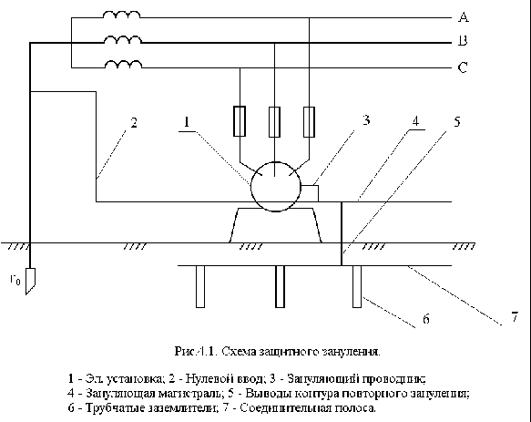 СХЕМА, НАЗНАЧЕНИЕ, ПРИНЦИП ДЕЙСТВИЯ И ОБЛАСТЬ ПРИМЕНЕНИЯ ЗАНУЛЕНИЯ. НЕОБХОДИМОСТЬ ПОВТОРНОГО ЗАЗЕМЛЕНИЯ НУЛЕВОГО ПРОВОДА Зануление – металлическое соединение корпуса электроустановки с нулевым проводом, позволяющим свести аварийный режим к однофазному короткому замыканию с последующим отключением поврежденного контура в минимально короткое время (0,2с). Зануление применяют в четырех проводных сетях с глухо-заземленной нейтралью напряжением до 1000В. Защитный эффект зануления состоит в уменьшении длительности замыкания на корпус и, следовательно, в снижении времени воздействия электрического тока на человека. Схема защитного зануления показана на рис.4.1.
