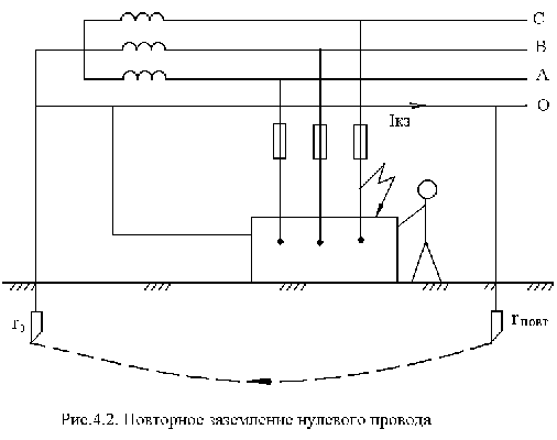 Повторное заземление нулевого провода необходимо для обеспечения лучшей защиты человека от поражения электрическим током. Как видно из рис.4.2. при обрыве нулевого провода, при переходе электрического тока на корпус электроустановки ток короткого замыкания протекает через сопротивление повторного заземления и сопротивления заземления (r 0 ), и фазу (С).