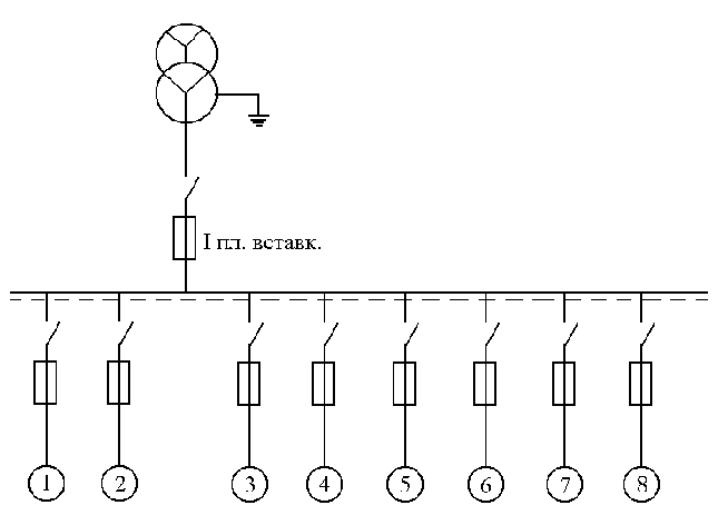 Кратность пускового тока для эл. двигателей с к.з. ротором принять равной 5…6,25. Коэффициент мощности потребителей принять 0,7…0,8. Коэффициент запаса плавкой вставки принять 2,5 – для легких условий пуска; 2,0 – для тяжелых условий пуска. Составление однолинейной схемы питания потребителей эл-кой энергии.