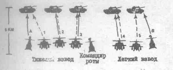 Схема 4 Условные обозначения —— Лазерное целеуказание --- Траектория полета ракеты "Хеллфайр" На схеме 5 приводится пример нанесения поражения противнику противотанковой вертолетной ротой с применением способа автономного ведения огня и ведения огня о дистанционным целеуказанием при нахождении вертолетов рот на нескольких позициях. В данном примере тяжелый взвод занимает боевую позицию, которая обеспечивает ему возможность нанесения поражения противнику, применяя способ автономного ведения огня. Легкий вертолетный взвод находится на удалении от других вертолетов огневой поддержки с тем, чтобы его вертолеты представляли собой менее уязвимые цели. Тяжелый вертолетный взвод наносит поражение целям, применяя способ автономного ведения огня, а легкий - способ ведения огня с дистанционным целеуказанием.
