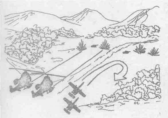 Схема 8. Порядок последовательного нанесения ударов. Совместное нанесение ударов. Если позволяет обстановка и местность, все самолет и вертолеты смешанной самолетно-вертолетной ударной группы могут атаковать цели одновременно с одного направления. При этом они придерживаются следующего порядка действий: вертолеты огневой поддержки наносят поражение цели, а самолеты непосредственной авиационной поддержки (пара или звено) в это время проходят ориентир выхода на цель. После того, как они сделают маневр типа “горка” с тем, чтобы начать атаку цели, вертолеты огневой поддержки укрываются (маскируются). А с момента, когда самолеты начнут выполнение маневра ухода с тем, чтобы выйти из района цели, они выходят из укрытий и возобновляют нанесение ударов по цели. Пример варианта совместного нанесения ударов приводится на схеме 9.