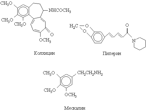 Структура алкалоидов Достаточно взглянуть на формулы нижеприведенных соединений, чтобы стало очевидным, почему химики, при попытках уяснить их природу и взаимные отношения, наталкивались на трудности. Например, колхицин и пиперин не имеют основного характера, в то же время колхицин и такие b -фенилэтиламины, как мескалин, не являются гетероциклами: