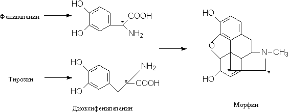 При кормлении мака Papaver somniforum мечеными фенилаланином и тирозином был получен морфин, содержащий изохинолиновое кольцо.