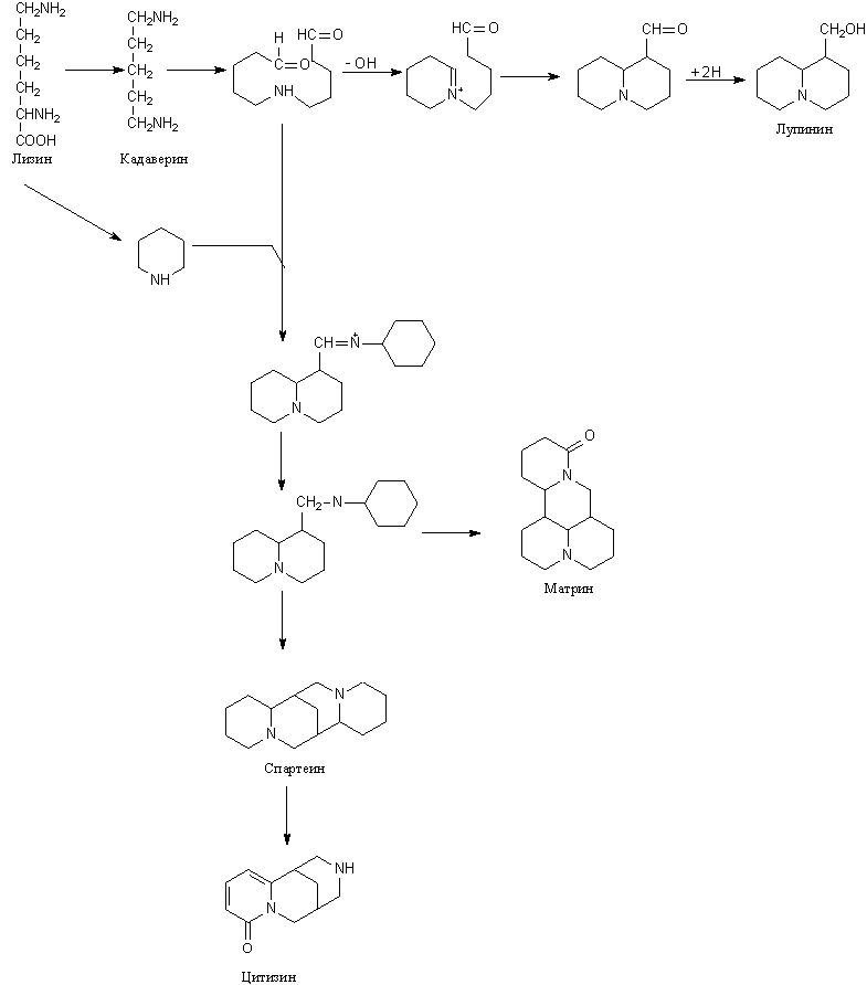 Лизин превращается в амин кадаверин, который является непосредственным предшественником анабазина, лупинина, спартеина и других алкалоидов: