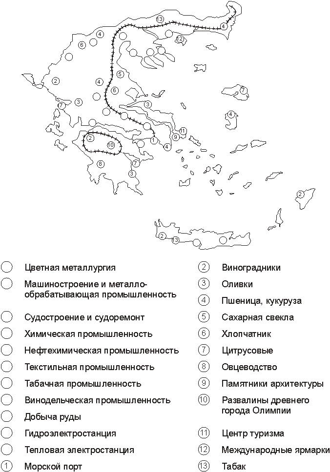Подобно другим небольшим европейским капиталистическим странам, в Греции промышленность развита непропорционально по своей отраслевой структуре и очень неравномерно размещается на территории страны, некоторые важнейшие отрасли совсем отсутствуют, например авиационная, станкостроение. Индустриальное лицо страны до сих пор определяют традиционные отрасли легкой индустрии: текстильная, пищевая, табачная, усиливается экспортное значение швейной и обувной промышленности. Однако в последние годы относительно быстро растут металлургия, нефтехимия, электротехника, цементное производство и традиционная для Греции горнодобывающая промышленность. Греческая промышленность работает в основном на внутренний рынок, хотя и его сравнительно небольшие запросы удовлетворяются далеко не полностью. Особенно быстро развивается индустрия в столичном районе Афин – Пирей, где сосредоточено 2/3 производственных мощностей страны. Единственный промышленный город, который в какой-то мере можно сравнивать с Афинами – Салоники. Растет промышленность в Патрах, Волосе, Ираклионе. Большое внимание в Греции уделяется развитию традиционной горнодобывающей промышленности. Месторождения полезных ископаемых в стране довольно многочисленны, но большей частью небогаты. Наиболее важна добыча бокситов, железноникеливых руд и бурого угля. По запасам бокситов Греция занимает одно из первых мест в зарубежной Европе. Достоверные запасы их составляют 1200 млн. тонн, а вероятные более 500 млн. тонн. Бокситы добывают в центральной Греции, вблизи гор Парнас и Гьона, а с недавнего времени также близ города Флорина, на севере страны. С древнейших времен в Греции добывают руды свинца, меди, серебра и других металлов. Один из самых древних рудников мира вблизи города Лавриона, на полуострове Аттика, дает ежегодно около 18 тыс. тонн свинца и примерно 15,5 тонн серебра. Комплексные сульфидные руды, содержащие эти металлы, добываются также близ Александруполиса во Фракии и на востоке Пелопоннеса. Близ Казани, на севере Греции обнаружены богатые залежи хромитового железняка и крупные месторождения асбеста. Греция богата также магнезитовым сырьем. С античных времен славится греческий мрамор разных цветов. И ныне карьеры есть в Аттике и на некоторых островах, но мрамор уже не играет такой роли в хозяйстве, как в древности. Энергетическими ресурсами страна бедна и располагает лишь довольно крупными месторождениями низкокачественного бурого угля-лигнита, общие запасы которого составляют 5 млрд. т. Главные буроугольные месторождения Греции расположены в окрестностях Птолеманса и на полуострове Пелопоннес, близ города Мегалополиса. Недавно вблизи острова Тасос в Эгейском море были открыты месторождения нефти с запасами в 19 млн. т и подводные месторождения газа. Газ обнаружен также и на суше, в районе Флорин. Предприятий черной металлургии в Греции не насчитывается и десяти. Все они размещены в трех центрах: Больших Афинах, Солониках и Волосе. Среди них имеется только один металлургический завод полного цикла в Больших Афинах. Основа металлургии страны – выплавка алюминия и ферроникеля. В Греции действует единственное предприятие по выпуску глинозема и алюминия мощностью свыше 140 тыс. тонн металла в год, построенное в районе Парнасского месторождения бокситов, ряд