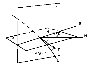 Угол отклонения вектора от горизонтальной плоскости называется углом магнитного наклонения I и связан с составляющими вектора простым соотношением tg I = z/H . Распределение интенсивности геомагнитного поля изображают на картах, где равные значения напряженности ( T, z ,H ) образуют изодинамы , равные углы магнитного склонения - изогоны , а равные углы магнитного наклонения - изоклины. Напряженность поля в целом увеличивается по направлению к магнитным полюсам. Около географического экватора проходит изодинама минимальной магнитной напряженности - динамический экватор, в пределах которого вертикальная составляющая z равна нулю. Изоклины изменяются от нуля до 90 о . Они имеют тенденцию прослеживаться в широтном направлении подобно параллелям. Нулевая изоклина называется магнитным экватором и проходит в пределах Африки и Азии около 10 о с.ш. и в пределах Южной Америки - около 15 о ю.ш.