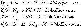 Так же была разработана цепная схема окисления азота, в которой активную роль играют свободные атомы кислорода и азота :