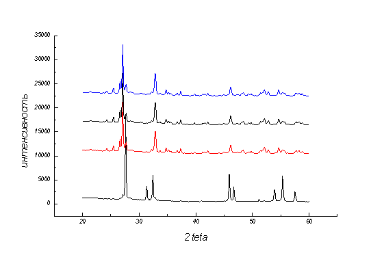 Рис.3 Рентгенограммы твердого раствора Bi 0.98 Ca 0.02 O y после различных времен отжига при 550С (а - 1 мин, б - 2 мин, в - 5 мин, г - 15 мин). - тетрагональный твердый раствор, - моноклинный твердый раствор, - ромбоэдрический твердый раствор.