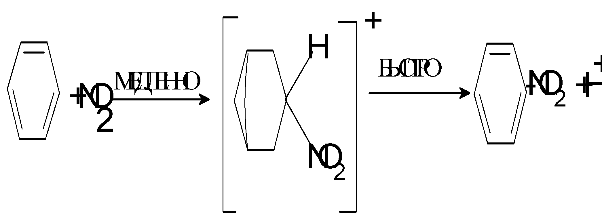 Важность ионизации первого типа подтверждается тем, что добавление ионизированных нитратов к реакционной смеси замедляет реакцию. Процесс нитрования можно представить в виде: