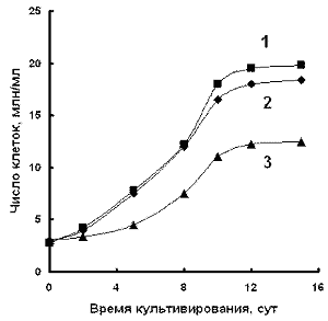 Рис. 1. Эффект ванадата на рост культуры Ps. diminuta ; 1 - контроль; 2, 3 - в присутствии 100 и 700 мг/л ванадата соответственно. Результаты и их обсуждение Клетки Ps. diminuta , изолированные из пробы придонного осадка промышленного водоема, сбросовые воды которого содержат как отходы металлургического производства ванадий в концентрации 100-700 мг/л, хорошо растут как без ванадата, так и в его присутствии; при этом максимальное количество клеток бактерий достигает 2x10 7 кл/мл среды через 12-16 суток культивирования (рис. 1). Ванадат в концентрации 700 мг/л снижает накопление биомассы Ps. diminuta на 30-40%. В дальнейших опытах ванадат добавляли в концентрации 100 мг/л, поскольку не оказывая заметного влияния на рост бактерий, ванадат в этой концентрации значительно стимулировал выделение из клеток низкомолекулярных белков. Применение метода диализного (смешанно-раздельного) культивирования фототрофных микроорганизмов - цианобактерий или микроводорослей с гетеротрофными бактериями рода Pseudomonas (Гусев и др., 1988) позволило выявить ряд закономерностей роста двух различных культур, разделенных полупроницаемой мембраной. При культивировании фототрофного компонента в присутствии ванадата клетки активно выделяют в среду углеводы и гликолат. Эти соединения используются для роста гетеротрофным компонентом в качестве субстратов окисления. При этом бактерии эффективно поглощают ванадат, существенно снижая его концентрацию в среде (Саванина и др., 1994; Гусев и др., 1997).
