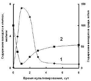 Рис. 2. Содержание ванадата в клетках (1) и в среде (2) в зависимости от возраста культуры Ps. diminuta . Действительно, как показывают наши опыты содержание ванадата в клетках Ps. diminuta , в течение первых 2 суток культивирования быстро увеличивается от 0 до 5-6 мкг/млн клеток, а затем снижается приблизительно в 10 раз (рис. 2, кривая 1). Иная картина наблюдается относительно концентрации ванадата в культуральной жидкости. За первые двое суток культивирования Ps. diminuta содержание ванадата в среде падает от 100 до 10-12 мг/л, а затем начинает постепенно увеличиваться по мере развития культуры; причем в среду возвращается до 60% ванадата (рис. 2, кривая 2). Как видно, накопление ионов ванадия в клетках коррелирует c его содержанием в культуральной жидкости: увеличение концентрации ванадата в клетках сопровождается ее снижением в среде культивирования и наоборот. Столь значительное увеличение концентрации ванадата в среде по мере выхода кривой роста на стационарный уровень может быть обусловлено тем, что ванадат выделяется из нативных и разрушенных клеток вместе с компонентами связывающими металл. Такими компонентами прежде всего являются низкомолекулярные богатые SH-группами белки; могут быть и другие тиоловые соединения, к которым относятся глутатион, цистеин, тиогликолевая кислота, дитиоэтанол, дитиопропанол и т.д. Известно, что специфическую устойчивость фототрофных микроорганизмов к действию ТМ обеспечивает наличие в клетках SH-содержащих белков с мол. м. до 10 кДа, связывающих большую часть поглощенных клетками ТМ (Obata et al., 1994). Содержание низкомолекулярных белков и коррелирующее с ним содержание SH-групп в клетках цианобактерий возрастает под действием ванадата (Лебедева и др., 1993). Выделенный из клеток Anacystis nidulans белок был идентифицирован как МТ II класса, связывающий ванадий (Саванина и др., 1995). Известно, что МТ большинства прокариот как правило состоят из одной полипептидной цепи с мол. м. до 7-10 кДа и высоким содержанием цистеина (в среднем до 30%) (Kagi, 1993). Клетки Ps. fluorescens выделяют в среду связывающие ионы Zn полипептиды с мол. м. 1-3,5 кДа. (Appana, Whitmore, 1995). Поскольку клетки Ps. diminuta выделены из ванадийсодержащего промышленного водоема и по данным рис. 1 устойчивы к действию ванадата, представляет интерес определение содержания низкомолекулярных белков и SH-групп в культуральной жидкости Ps. diminuta в динамике развития культуры.