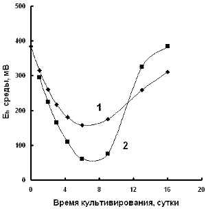 Рис. 4. Изменения величины E h среды в динамике развития культуры Ps. diminuta . 1 - контроль; 2 - в присутствии 100 мг/л ванадата. Колоколообразная зависимость накопления SH-групп в среде от возраста культуры Ps. diminuta сопровождается сходной зависимостью снижения E h среды. По мере развития культуры величина E h уменьшается и достигает минимума (180-200 мВ) к 6-8 суткам, а затем вновь возрастает (рис. 4, кривая 1). В присутствии ванадата минимальное значение E h достигает 80 - 90 мВ (кривая 2). Столь низкие значения E h в аэробных условиях могут быть обусловлены только наличием в среде значительных количеств тиолсодержащих соединений, стандартный редокс-потенциал которых в анаэробных условиях существенно ниже 0 мВ. Так, например, 1,4-дитиотреитол, эффективно восстанавливающий SH-группы ферментов и кофакторов, имеет стандартный потенциал -330 мВ при pH 7; сходными окислительно-восстановительными свойствами обладают тиогликолевая кислота, 2-меркаптоэтанол, димеркаптопропанол и др. (Досон и др., 1991). В отличие от тиолов такие соединения, как органические кислоты, имеют стандартные редокс-потенциалы в интервале от 50 до 250 мВ. Согласно нашим данным (рис. 5) для достижения величины E h около 200 мВ содержание аскорбата в среде в аэробных условиях должно составлять несколько мМ (кривая 2), а в случае гликолата его концентрация при E h около 300 мВ достигает 200-400 мМ (кривая 3).