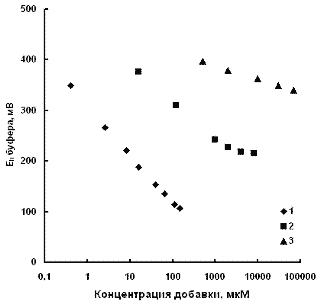 Рис. 5. Зависимость величины E h от концентрации SH-групп цистеина, инкубируемого в 20 мМ буфере морфолинопропансульфонате (pH 7,0). На рис. 5 также показана зависимость величины E h буферного раствора от концентрации SH-групп цистеина (кривая 1). Видно, что величинам E h около 200 и 100 мВ соответствуют концентрации SH-групп около 20 и 120 мкМ. Эти значения согласуются с величинами E h (рис. 4) и концентрациями SH-групп (рис. 3) в культуральной жидкости Ps. diminuta . Таким образом, полученная корреляции между содержанием ванадата в клетках и культуральной жидкости Ps. diminuta , накоплением низкомолекулярных белков и SH-групп и изменениями E h среды культивирования бактерий позволяют полагать, что ионы ванадия, поглощенные клетками Ps. diminuta стимулируют образование тионеинподобных белков, связываются с ними с участием SH-групп и выделяются из клеток вместе с белками, продуктами их деградации или с другими тиоловыми соединениями. Список литературы
