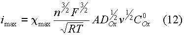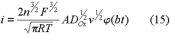 Найденная любым из приведенных способов функция определяет форму вольтамперных кривых в случае обратимого электродного процесса. Уравнение тока пика легко получили на основе уравнения (7) и графика функции (8 - 11). Это выражение известно как уравнение Рендлса - Шевчика: