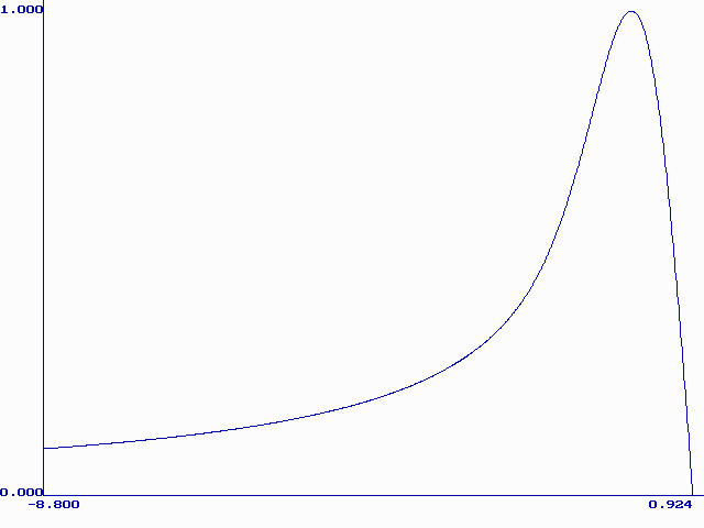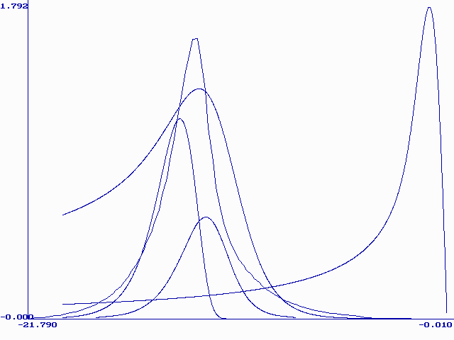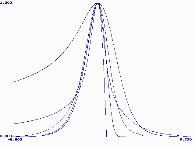 Модель М. Никольсон описывает форму вольтамперной кривой при растворении монослоя металла с поверхности твердого электрода. Кривая описывается уравнением (21) в интегральной форме. Форму вольтамперной кривой описывает первая производная функции y (bt). Были составлены таблицы значений y ў (bt) при разных значениях H. На рис. 3 приведены нормированные (все максимумы сведены в точку (0;1)) графики функции y ў (bt) при H=0.1, 1, 3, 10, 100, 1000, 10000, 170000. Из этого рисунка видно, что при больших H форма кривой становится постоянной. Высота максимума при Hі 100 почти не меняется (0.298± 0.002), а потенциал максимума смещается в область более положительных значений согласно уравнению (26):