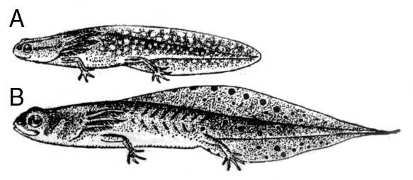 Рис.6. Личинки: А – обыкновенного тритона, Triturus vulgaris lantv , В – гребенчатого тритона, Triturus cristatus.