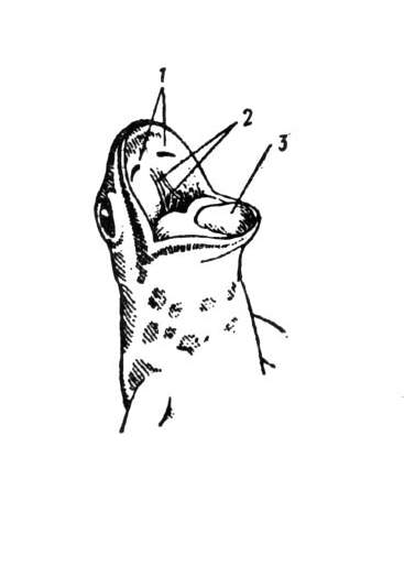 Рис. 7. Ротовая полость обыкновенного тритона, Triturus vulgaris lantv: 1 – хоаны, 2- небные зубы, 3 – язык.