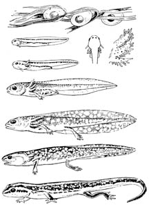 Рис. 8. Развитие обыкновенного тритона: 1 – яйцо; 2 – личинка в момент выклева; 2а – передняя часть той же личинки снизу; 3 – стадия прорыва ротового отверстия наружных жабр; 4 – стадия полного отверстия наружных жабр и расчленения передних конечностей; 4а – детали строения наружных жабр; 5 – стадия расчленения передних и задних конечностей; 6 – начало редукции жабр и плавниковых складок; 7 – стадия выхода на сушу. Поделитесь этой записью или добавьте в закладки |