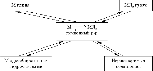 Рис. 1 На рисунке Л р – растворимые лиганды, какими являются органические кислоты с малым молекулярным весом, а Л н – нерастворимые. Реакция металлов (М) с гумусовыми веществами включает частично и ионный обмен. Конечно, в почве могут присутствовать и другие формы металлов, которые не участвуют непосредственно в этом равновесии, например, металлы из кристаллической решетки первичных и вторичных минералов, а также металлы из живых организмов и их отмерших остатков. Наблюдение за изменением тяжелых металлов в почве невозможно без знания факторов, определяющих их подвижность. Процессы передвижения удержания, обуславливающие поведение тяжелых металлов в почве, мало чем отличаются от процессов, определяющих поведение других катионов. Хотя тяжелые металлы иногда обнаруживаются в почвах в низких концентрациях, они формируют устойчивые комплексы с органическими соединениями и вступают в специфические реакции адсорбции легче, чем щелочные и щелочноземельные металлы. Миграция тяжелых металлов в почвах может происходить с жидкостью и суспензией при помощи корней растений или почвенных микроорганизмов. Миграции растворимых соединений происходит вместе с почвенным раствором (диффузия) или путем перемещения самой жидкости. Вымывание глин и органического вещества приводит к миграции всех связанных с ними металлов. Миграция летучих веществ в газообразной форме, например, диметила ртути, носит случайный характер, и этот способ перемещения не имеет особого значения. Миграция в твердой фазе и проникновение в кристаллическую решетку являются больше механизмом связывания, чем перемещения. Тяжелые металлы могут быть внесены или адсорбированы микроорганизмами, которые в свою очередь, способны участвовать в миграции соответствующих металлов. Дождевые черви и другие организмы могут содействовать миграции тяжелых металлов механическим или биологическим путями, перемешивая почву или включая металлы в свои ткани. Из всех видов миграции самая важная – миграция в жидкой фазе, потому что большинство металлов попадает в почву в растворимом виде или в виде водной суспензии и фактически все взаимодействия между тяжелыми металлами и жидкими составными частями почвы происходит на границе жидкой и твердой фаз. Тяжелые металлы в почве через трофическую цепь поступают в растения, а затем потребляются животными и человеком. В круговороте тяжелых металлов участвуют различные биологические барьеры, вследствие чего происходит выборочное бионакопление, защищающее живые организмы от избытка этих элементов. Все же деятельность биологических барьеров ограничена, и чаще всего тяжелые металлы концентрируются в почве. Устойчивость почв к загрязнению ими различна в зависимости от буферности. Почвы с высокой адсорбционной способностью соответственно и высоким содержанием глин, а также органического вещества могут удерживать эти элементы, особенно в верхних горизонтах. Это характерно для карбонатных почв и почв с нейтральной реакцией. В этих почвах количество токсических соединений, которые могут быть вымыты в грунтовые воды и поглощены растениями, значительно меньше, чем в песчаных кислых почвах. Однако при этом существует большой риск в увеличении концентрации элементов до токсичной, что вызывает нарушение равновесия физических, хим