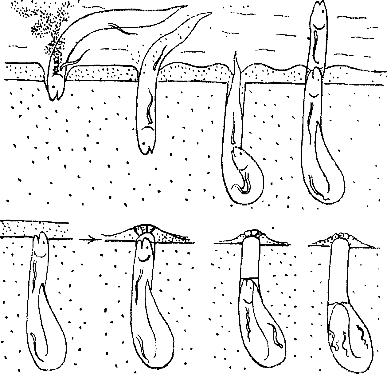 Во время спячки протоптера вся вода, образующаяся при расщеплении белков, теряется при дыхании и моча не выделяется (да ее и некуда было бы вывести, так как рыба заключена в кокон, плотно облегающий ее тело). Поэтому образующаяся мочевина в огромных количествах скапливается в организме, составляя к концу спячки 1—2% массы тела, что следует рассматривать как удивительный физиологический парадокс: на большинство позвоночных животных избыток мочевины в организме действует как сильнейший яд, и смерть наступает при ее концентрации, в 2 тыс. раз меньшей, чем у спящего протоптера, которому она не причиняет никакого вреда. Уже через несколько часов после выхода протоптера в воду весь избыток мочевины выводится из организма через жабры и почки. В зависимости от местных условий, значительно колеблющихся в разные годы, протоптер проводит в спячке 6—9 месяцев. Любопытный рекорд был побит бурым протоптером, который в экспериментальных условиях провел в беспрерывной спячке свыше четырех лет без каких-либо вредных последствий для себя. Однако в тех случаях, когда водоемы не пересыхают, протоптеры в спячку не впадают. Этого легко добиться и в аквариумных условиях. Тем не менее было замечено, что “бодрствующие” в течение ряда лет протоптеры, содержащиеся в аквариуме (один из них провел без спячки 13 лет), время от времени становятся вялыми, малоподвижными и даже отказываются от пищи. Такое состояние замечается у них в среднем один раз в году и продолжается от нескольких недель до 2—3 месяцев без каких-либо признаков заболевания. Почти несомненно, что такое поведение связано с прирожденной привычкой впадать в спячку и что спячка составляет неотъемлемую часть жизненного ритма этих рыб. Ради точности следует добавить, что эти наблюдения производились над особями бурого протоптера, пойманными в бассейне Гамбии, где этот вид обычно впадает в спячку. Возможно, что у протоптеров других видов такая ритмика выражена не столь резко. Известно, например, что в Великих озерах Центральной Африки протоптеры в ежегодную спячку не впадают, так как для этого у них нет необходимости и соответствующих условий. С наступлением периода дождей пересохшие водоемы быстро наполняются водой и протоптеры возвращаются к активной жизни из своего добровольного заточения. Самый процесс их пробуждения в природе пока еще не прослежен, но о нем можно судить по специальному эксперименту, поставленному в 1931 г. (рис. 5). Этот простой опыт заключался в том, что вырубленные из грунта куски глины с заключенными в них протоптерами зарывались в мелкую лужу так, чтобы слой воды над ними не превышал 5 см. Приблизительно через час у выходного отверстия показалась первая рыба. После короткой рекогносцировки она поднялась к поверхности воды и жадно заглотнула воздух, чтобы тотчас после эюго скрыться в гнезде. Поначалу эти действия повторялись через каждые 3—5 мин^ но постепенно интервалы между очередными выходами к поверхности удлинились до обычных 10—20 мин. При этом рыба все меньше и меньше пряталась в гнезде, пока через 6—7 ч совем не покинула его. Замечено, что, чем дольше длится спячка у про•штера, тем больше времени требуется ему для того, чтобы стряхнуть с себя сон. В течение первых нескольких дней рыбы, проведшие в спячке 6—8 месяцев, плохо контролируют свои движения, передвигаясь р