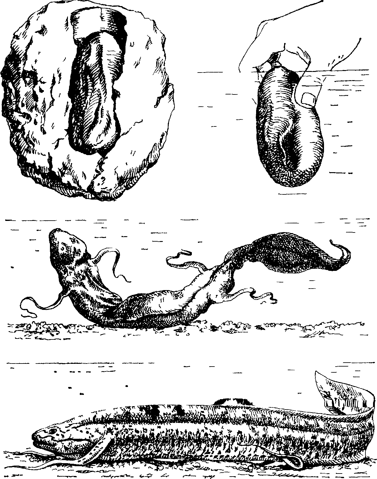 Двоякодышащие рыбы: 1 -— протоптер ; 2 — американский чешуйчатник; 3 — рогозуб издавая при этом характерный стонуще-хрюкающий звук, который далеко разносится по окрестности. Тотчас вслед за этим, сделав глубокий вдох, он медленно погружается на дно. И выдох и вдох производятся им через ноздри при плотно сомкнутых челюстях. Нельзя не признать, что при дыхании атмосферным воздухом действия рогозуба напоминают действия китообразных. Даже находясь в воде, содержащей достаточное количество кислорода, рогозуб, по-видимому, не может довольствоваться жаберным дыханием и дополняет его дыханием легочным. Последнее особенно полезно для него в засушливые сезоны, когда русла рек полностью пересыхают на больших пространствах и когда вода сохраняется лишь в наиболее глубоких ямах (бочагах). В таких постепенно усыхающих убежищах, ища спасения, скапливается множество рыб, и в том числе рогозубы. Когда в перегретой стоячей воде в результате гнилостных процессов исчезает почти весь кислород и все остальные рыбы дохнут от удушья, рогозуб продолжает благоденствовать, перейдя на дыхание атмосферным воздухом. И даже тогда, когда при затянувшейся засухе эти убежища превращаются в кладбище для всего живого, а вода в них — в зловонную жижу, в которой разлагаются сотни трупов погибших животных,— даже и тогда рогозуб выживает, дождавшись спасительных дождей. Однако полное высыхание водоема гибельно и для него, так как он не может впадать в спячку, зарывшись в грунт, подобно своим африканским и южноамериканскому сородичам. Вытащенный из воды рогозуб совершенно беспомощен и погибает скорее, чем многие другие рыбы, лишенные легких. Рогозуб — вялое и малоподвижное животное.Большую часть времени он обычно проводит на дне глубоких омутов, где лежит на брюхе или стоит, опираясь на парные плавники и на хвостовую часть тела. В поисках пищи он медленно ползает на брюхе, а подчас и ходит, опираясь на те же парные плавники. В толще воды он, как правило, медленно передвигается за счет едва заметных изгибаний своего тела. Только если его вспугнуть, рогозуб пускает в ход свой мощный хвост и выказывает свою способность к быстрому движению. Судя по всему, суточный ритм у этого животного выражен слабо и нередко рогозуб проявляет свою вялую активность в любое время дня и ночи. Его пищу составляют различные беспозвоночные (моллюски, ракообразные, личинки насекомых, черви и т. п.). Правда, кишечник рогозуба обычно набит мелко пережеванными растительными остатками, но, по всей видимости, растительная пища им не усваивается, а захватывается вместе с беспозвоночными животными. По крайней мере в неволе он безо всякого ущерба довольствуется “скоромной” пищей, не выказывая потребности в “вегетарианской” диете. Нерест рогозуба сильно растянут и продолжается с апреля по ноябрь. Наиболее интенсивно он идет в сентябре —октябре, когда наступает период дождей, реки вздуваются и вода в них хорошо аэрируется. Рогозуб откладывает икру на водную растительность и не проявляет дальнейшей заботы о потомстве. Так как оболочка у икринок не клейкая, то многие из них скатываются и падают на дно; не совсем ясно, как это сказывается на их выживании. Икринки довольно крупные, они достигают в диаметре 6,5—7,0 мм и заключены в студенистую оболочку, что делает их весьма сходными с лягушачьей икр