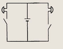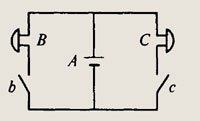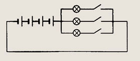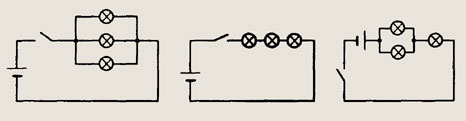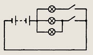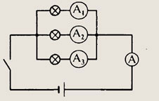 При замкнутых ключах 1 и 2 две лампы соединены параллельно и общее сопротивление цепи равно R/2 (R — сопротивление лампы). Если выключатель 1 разомкнуть, то сопротивление цепи будет равно /?, т. е. увеличится в 2 раза. Следовательно сила тока в цепи уменьшится в 2 раза и станет равной 1,5 А.