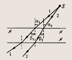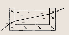 Световой луч преломляется 4 раза. Границы раздела: воздух — стекло, стекло — вода, вода — стекло, стекло — воздух.