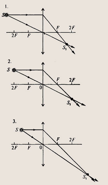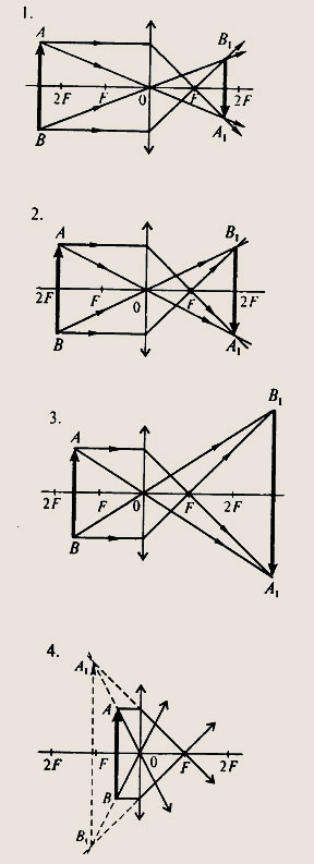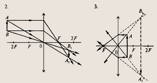 2. Изображение а) перевернутое; б) уменьшенное; в) действительное. 3. Изображение а) прямое; б) увеличенное; в) мнимое.