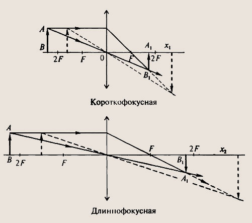 Из рисунков видно, что х2 > x1, следовательно у длиннофокусной.