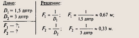 С помощью очков получить изображение лампы. Та линза, у которой фокусное расстояние больше, будет располагаться дальше от лампы. Больше масса линз с оптической силой D2 = 3 дптр.