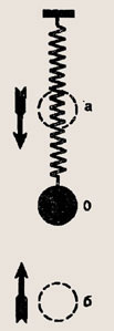 Задание 325. При колебательном движении шарик, подвешенный к пружине, периодически оказывается в положениях а, 0, б (рис. 61). Взаимодействием каких тел обусловлено движение шарика вниз; вверх?