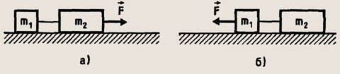 Задание 353. Два связанных невесомой нерастяжимой нитью тела массами m1 и m1>m1, лежат на гладком столе. Силу F прикладывают сначала к телу большей массы (рис. 71, а), а затем к телу меньшей массы (рис. 71, b). Одинакова ли сила натяжения нити?