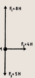Задание 392. Определите равнодействующую трех сил F1 = 8 Н, F2 = 4 Н и F3 = 5 Н, направленных так, как показано на рисунке 89. Каков характер движения тела М под действием этих сил?