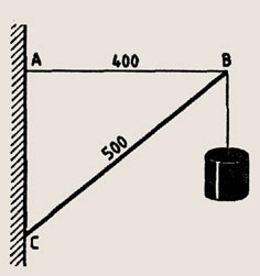 Задание 397. Сила тяжести, которая действует на груз, подвешенный к кронштейну, равна 60 Н. Найдите силы, действующие на горизонтальную поперечину AS, подкос ВС, линейные размеры которых даны в условных единицах на рисунке 91.