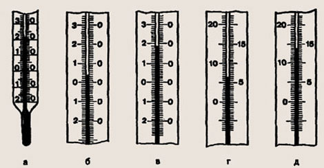 Задание 39. Определите цену деления шкалы каждого термометра (рис. 14). Какую максимальную температуру можно измерить термометрами, показанными на рисунке 14, б, д; минимальную (см. рис. 14, а, г)? Какую температуру показывает каждый термометр?