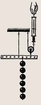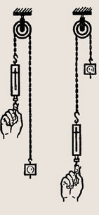 Задание 760. Через неподвижный блок перекинута цепь (рис. 217). В каком случае динамометр будет показывать меньшую силу при равномерном подъеме груза? Почему?