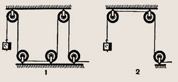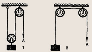 Задание 765. Для подъема одного и того же груза используют две системы блоков (рис. 222, 1, 2). Равные ли силы надо приложить в точках А, если трение в каждом блоке одинаково, а вес подвижного блока много меньше веса груза? Ответ объясните. Рис.222