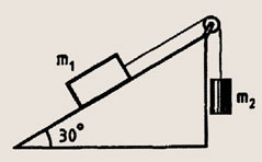 Задание 777. На наклонной плоскости с углом 30° при основании лежит брусок массой 1 кг (рис. 230). Гиря такой же массы присоединена к бруску с помощью невесомой нерастяжимой нити, перекинутой через легкий блок. Определите ускорение, с которым движутся оба тела, и силу натяжения нити. (Трением можно пренебречь.)