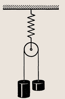 Задание 779. К пружинным весам (рис. 231) подвешен блок. Через блок перекинут нерастяжимый шнур, к концам которого привязаны грузы массами 1 кг и 2 кг. Какой вес будут регистрировать пружинные весы во время движения грузов? (Весом блока и шнура пренебречь.)