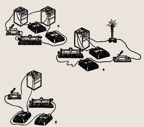 Задание 1367. На панели укреплены три патрона с электрическими лампами. Начертите схему соединения клемм ламп между собой и полюсами источника тока так, чтобы лампы были соединены параллельно; последовательно; две параллельно, а третья последовательно с ними.
