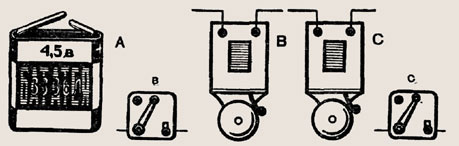 Задание 1371. На рисунке 335 показаны батарея A, два звонка В и С и два выключателя в и с. Начертите, как должны быть соединены они проводами, чтобы выключатель в управлял звонком В, а выключатель с — звонком С.