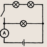 Задание 1376. Начертите схему цепи, состоящую из источника тока, трех ламп, включенных параллельно, амперметров, измеряющих силу тока в каждой лампе и во всей цепи, и выключателя, общего для всей цепи.