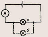 Задание 1378. Амперметр, включенный в цепь, состоящую из источника тока и электрической лампы а, показывает некоторую силу тока. Как изменится показание амперметра, если в эту цепь включить еще одну лампу б (рис. 341)?