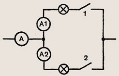 Задание 1385. В цепь (рис. 342) включены две одинаковые лампы. При замкнутых выключателях 1 и 2 амперметр А показывает силу тока 3 А. Что покажет амперметр А2, если выключатель1 разомкнуть? (В цепи постоянное напряжение.)