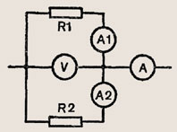 Задание 1387. Амперметр А (рис. 343) показывает силу тока 1,6 А при напряжении 120 В. Сопротивление резистора R1 = 100 Ом Определите сопротивление резистора R2 и показания амперметров А1 и А2.
